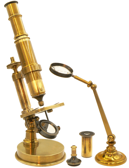Microscope "grand modèle" MOLTENI avec sa loupe articulée pour l'éclairage des objets opaques et son supplément optique |