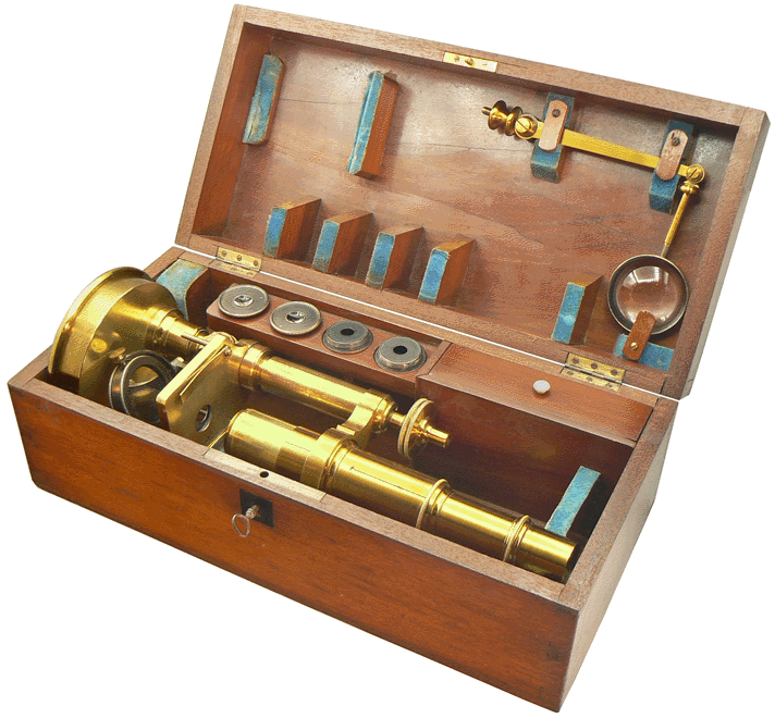 Accompagné d'une loupe sur pied pour l'éclairage des objets opaques, de deux oculaires et de deux objectifs, le microscope est proposé, dans son coffret en acajou de 34 x 16,5 x 13 cm, pour 150 francs en 1880. |