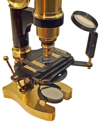 L'éclairage est assuré par un miroir double, plan d'un côté et concave de l'autre, et par une lentille lors de l'observation des objets opaques. Miroir et lentille possèdent les mêmes articulations permettant toutes les inclinaisons ; la lentille amovible est, de plus, enfichée sur un bras horizontal pivotant. Un disque diaphragme à trois positions complète le système. |