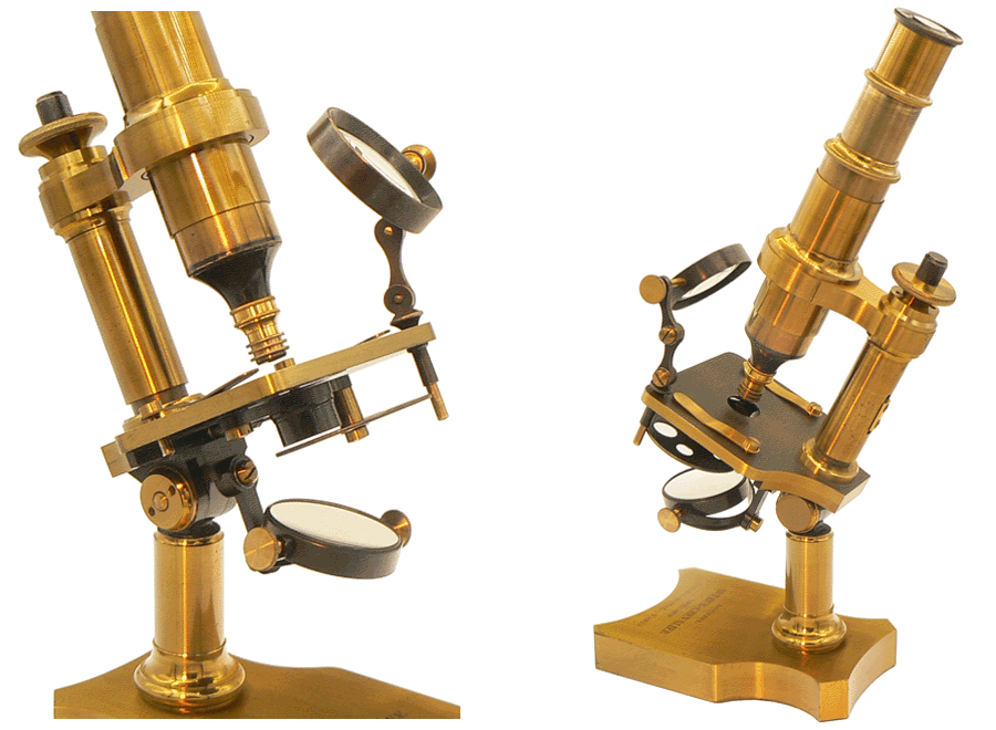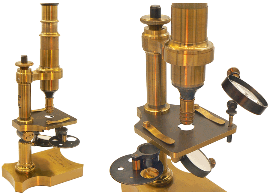 Microscope moyen modèle, accompagné de ses objectifs - hauteur minimum 28 cm - 1873 - Tous les élément sont marqués du chiffre 3 |