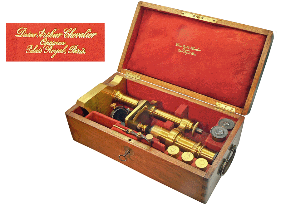 Près du dessin du catalogue du Dr Arthur Chevalier de 1872, la légende précise que "le modèle est très apprécié des gens du monde et des savants, car l'inclinaison permet de continuer les observations sans causer de fatigue". Dans son coffret en noyer, il est alors vendu 215 Francs. |