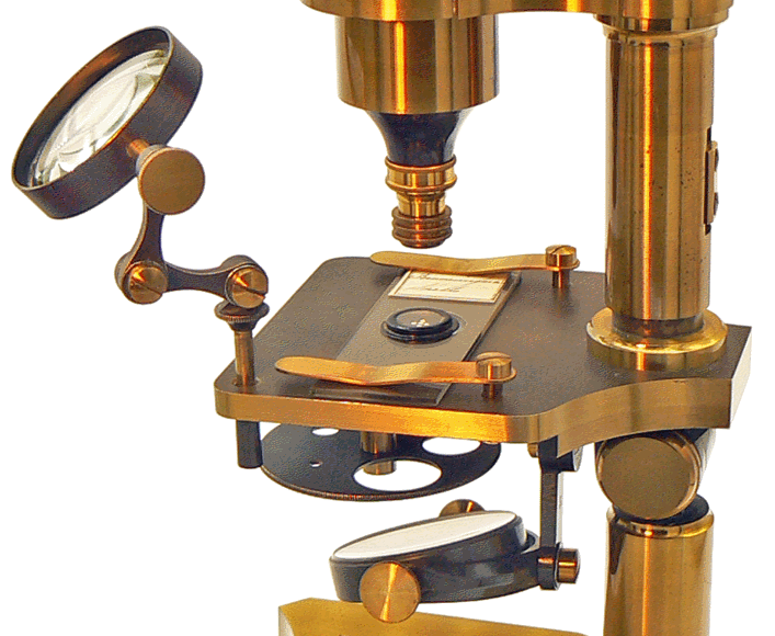 Le réglage grossier est réalisé par le coulant et le réglage fin par vis micrométrique. Le miroir concave, à articulation et rotation, permet l'éclairage oblique. |