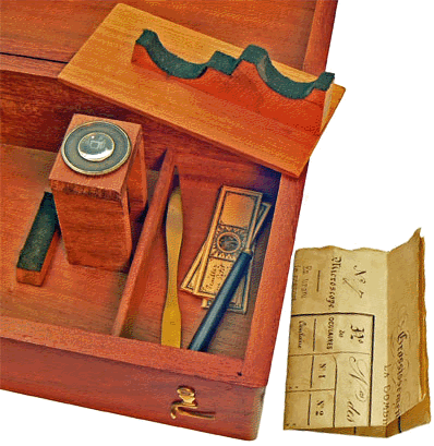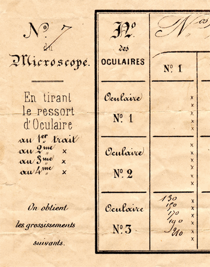 Dans la petite case, ménagée dans le coffret du microscope, sont rangés le tableau des grossissements, une aiguille fine montée, une pince très élégante et trois préparations microscopiques. |