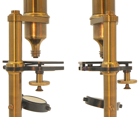 La mise au point s'effectue, d'abord par le coulant puis en agissant sur l'inclinaison de la platine. D'un côté, celle-ci pivote autour d'un axe horizontal tandis que sur le côté opposé, un système constitué d'une vis micrométrique et d'un écrou moleté permet de modifier son inclinaison, donc d'éloigner ou de rapprocher la zone de préparation observée de l'objectif du microscope. La méthode n'est pas totalement satisfaisante car le fait d'incliner la préparation empêche une mise au point homogène. |