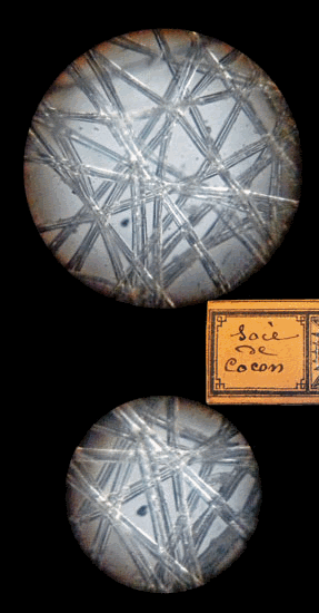 Le tube oculaire - nous ignorons pourquoi il est appelé "ressort d'oculaire" sur le document accompagnant l'instrument - coulisse dans le tube optique. Il porte 4 traits permettant de repérer sa position et de connaître le grossissement correspondant. Nous avons photographié une lame de soie de cocon présente dans le coffret. Pour obtenir l'image du haut, le tube est complètement rentré ce qui correspond à un grossissement de 130 fois. La seconde image est obtenue tube oculaire tiré jusqu'au quatrième trait : le grossissement est alors égal à 210 fois mais le champ de vision se trouve réduit à cause de l'allongement du tube optique. |
