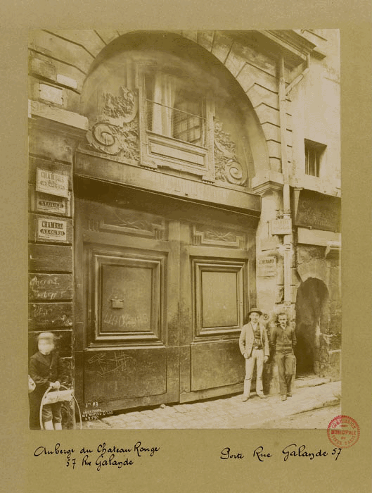 Cette image date de la fin du XIXe siècle. On distingue, au-dessus des deux personnages posant devant le pilier droit de la porte du 57 de la rue Galande, la plaque du fabricant de microscopes Jean MIRAND. Le numéro 57, était surtout connu pour être l'entrée de l'Auberge du Château Rouge proposant aux moins pauvres des chambres succinctement meublées et aux plus démunis, le sol nu de ses dortoirs. L'immeuble a été détruit l'année suivant celle de la photographie, c'est-à-dire en 1899. |
