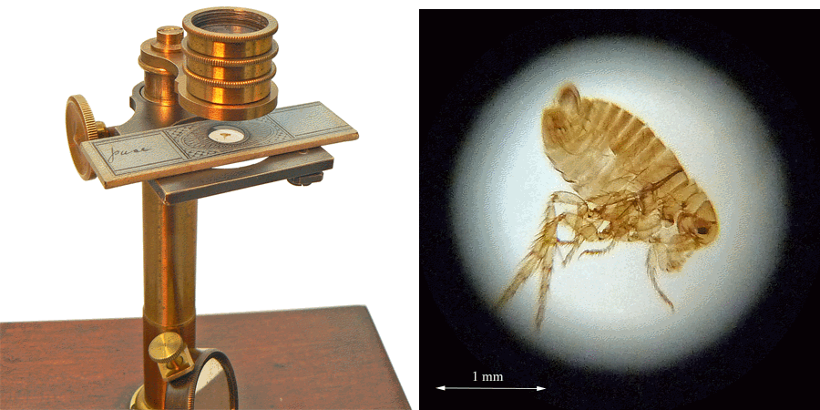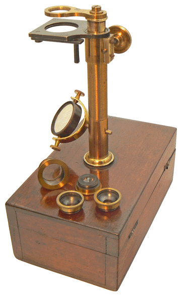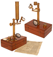 A gauche, présenté dans l'édition de 1868 de l'ouvrage de William B. Carpenter, The Microscope and its revelations, le microscope simple de Robert Field & Son, créé pour l'observation des fleurs et des insectes. En 1855, son constructeur à reçu le "Society of Arts Prize Microscopes", pour la qualité de l'instrument et son prix raisonnable. Beaucoup se sont, par la suite, inspirés du modèle. C'est le cas de L. Casella (Londres), James W. Queen & Co (Philadelphie) et, ici à droite, de R. & J. Beck (Londres) pour The School Microscope sorti du catalogue de 1882. Notre spécimen ressemble particulièrement à ce modèle même si la loupe d'éclairement des objets opaques fait défaut. |