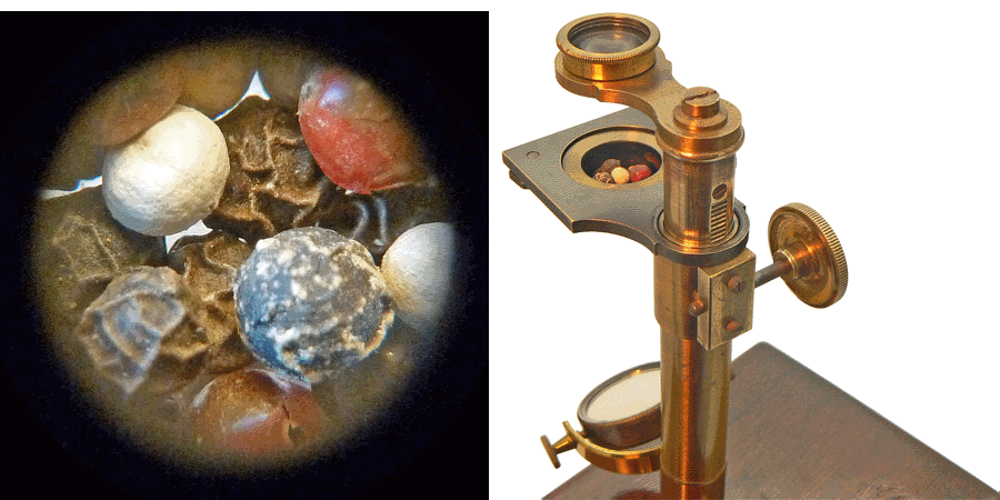 Une cuve à fond transparent, s'encastre dans la platine. Elle facilite l'observation d'animalcules en milieu aqueux. Il s'agit bien d'une cuve unique, photographiée recto-verso, et non d'une live box dont on verrait les deux parties. En l'absence de petites bêtes nageuses, nous l'avons utilisée pour observer, au faible grossissement donné par une seule lentille, les graines d'un mélange de plusieurs sortes de poivre. |