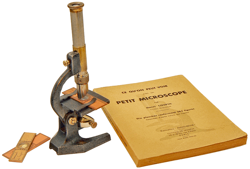 Il s'agit probablement d'une des premières versions du petit microscope CADY que l'on pouvait acquérir à la fin des années 1930. Près de lui, nous avons posé le livre d'Henri COUPIN, "CE QU'ON PEUT VOIR AVEC UN PETIT MICROSCOPE", devenu depuis sa parution en 1897 la référence pour les micrographes débutants. Il s'agit, ici, de l'édition de 1945. D'autres ont suivi... |