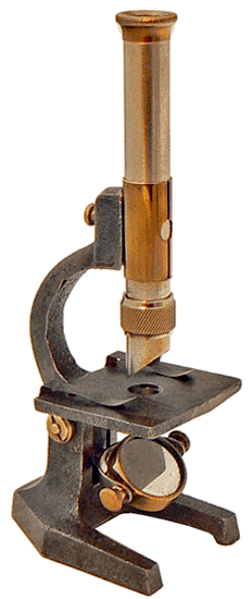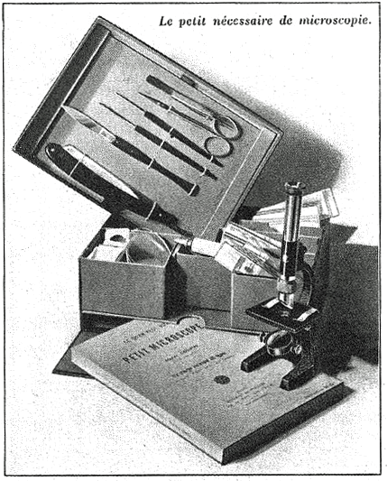 La particularité de ce petit microscope est de pouvoir devenir rapidement un instrument à main, d'une dizaine de centimètres, qui accompagne le naturaliste en herbe sur le terrain. |