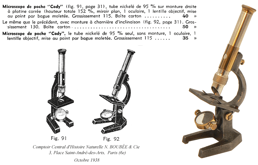 et le même ouvrage d'Henri COUPIN. Le dessin accompagnant le texte de Jules Peter ne laisse aucun doute sur le microscope : il s'agit d'un CADY. D'ailleurs, une recherche plus approfondie montre que l'opticien commercialisait le modèle. Des exemplaires portent, sur le pied, la marque J. PETER, 11 rue République, Lyon. |