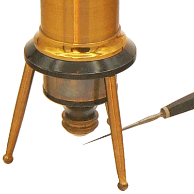 L'observateur se penche en avant pour viser à travers l'oculaire. Pour lui, l'aiguille montée, bien réelle, et l'image qui est donnée par l'instrument, sont toutes les deux dans le premier quadrant. S'il avance l'extrémité de l'aiguille dans un sens, son image se déplace dans le même sens : c'est une image droite. C'est un avantage lorsque l'on déplace des objets ou que l'on réalise une dissection sous l'objectif. En revanche, pour le grossissement mesuré égal à 40 fois, le champ de vision est égal à 2 millimètres ce qui est peu. Sur la photographie microscopique, on voit à peine plus du dernier millimètre de la pointe de l'aiguille. |