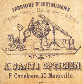 La maison A. SANTI, fondée en 1830 et installée à Marseille, fabrique des instruments d'optique, de marine et de géodésie, jusqu'en 1884. Elle obtient la médaille de 1ère classe aux expositions universelles de Paris, Marseille et Londres. En 1868, hors concours, elle est membre du Jury à l'Exposition Maritime du Havre. |