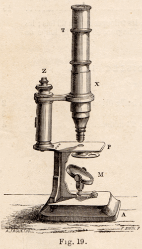 Quelle que soit l'année et le support, la représentation du microscope usuel est toujours celle de la 1ère édition de 1864 de L'ÉTUDIANT MICROGRAPHE : on la retrouve sur la NOTICE SUR L'USAGE DU MICROSCOPE intégrée au catalogue illustré de 1872 : |