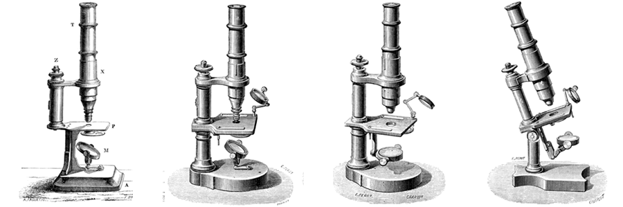Dans le catalogue de 1872, la présentation des microscopes achromatiques "pour l'histoire naturelle, l'histologie, la médecine, etc." débute par les quatre modèles représentés ci-dessous : le Microscope usuel, le Microscope d'étudiant avec pied en fonte vernie, le Microscope droit, avec pied en cuivre, petit ou moyen modèle et le Microscope à inclinaisons, moyen modèle. |