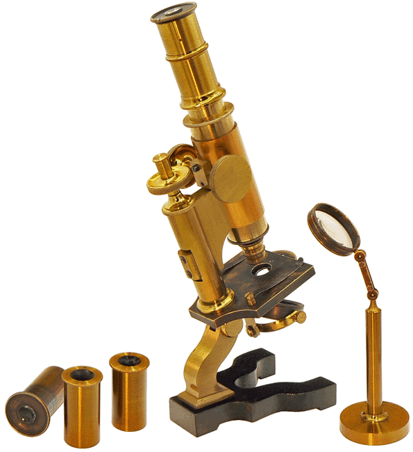 Microscope d'étude, hauteur minimum 28 cm, marqué J. CLARCKE, et loupe sur pied - Probablement France, vers 1900 |