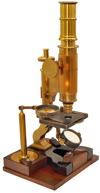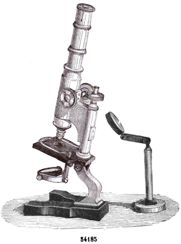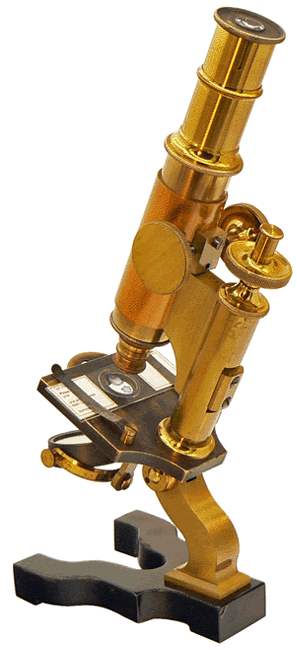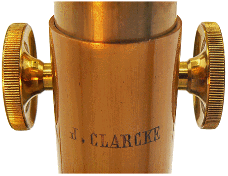 Le corps du microscope est gravé J. CLARCKE, nom à consonance anglo-saxonne : on peut penser qu'il s'agit du constructeur. Toutefois, en 1898, la SOCIÉTÉ DES LUNETIERS propose le même instrument dans son catalogue. En 1908, le microscope est toujours présent : avec une dotation optique permettant des grossissements jusqu'à 1000 fois, il est vendu 180 francs. |