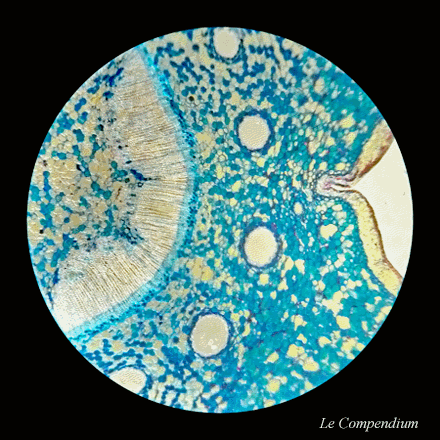Nous avons testé le microscope en observant une lame contemporaine de botanique. Il s'agit d'une coupe transversale de tige de pin d'une année. Les zones photographiées sous grossissement modéré sont la partie centrale, puis périphérique, de la tige. |