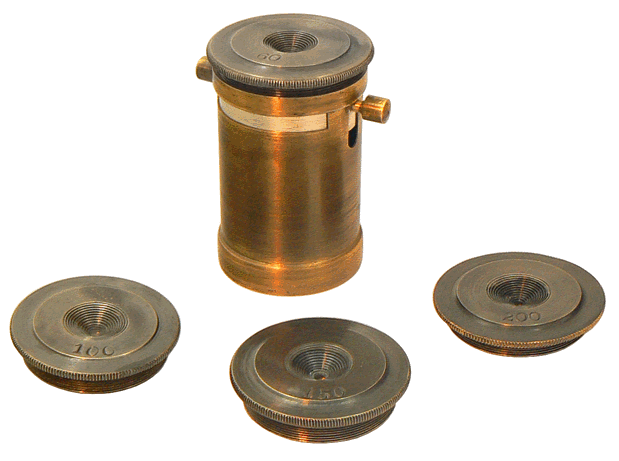 La longueur du corps du microscope, en laiton verni, est de 6 cm pour un diamètre de 4 cm. Il est accompagné de quatre optiques sur œilletons filetés en laiton bruni, donnant des grossissements linéaires de 60, 100, 150 et 200 fois. Il accepte les lames de 76 x 26 mm et est proposé tel un instrument "pour étudiant, le moins cher et le plus approprié"... |