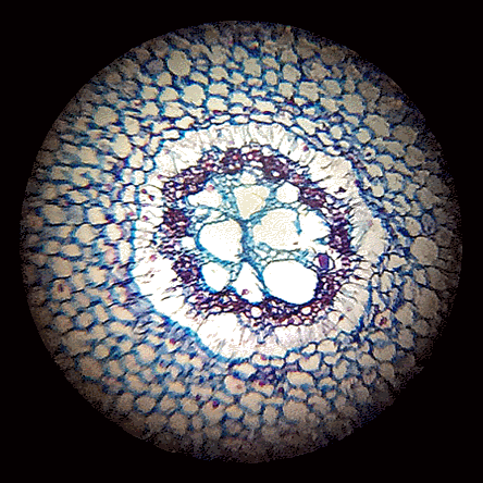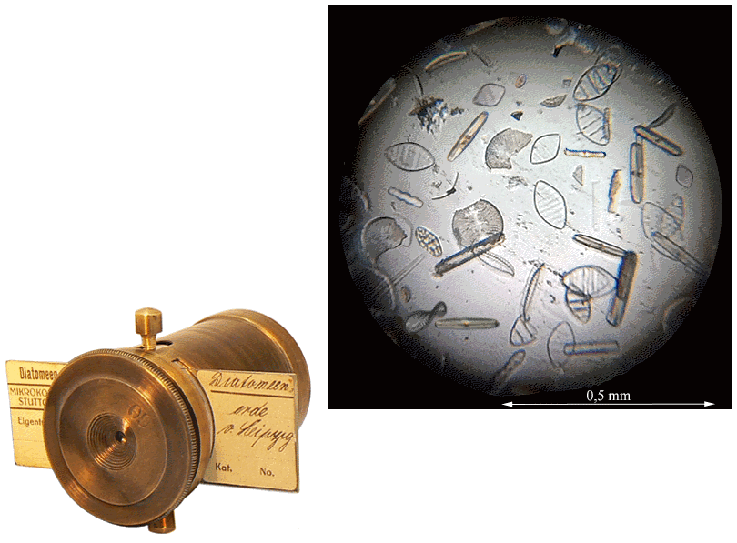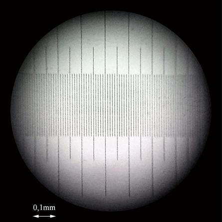 Nous avons testé l'instrument d'abord avec une des lames de diatomées contenues dans le coffret puis en observant, sur une préparation récente, la partie centrale d'une coupe transversale de racine d'Iris, au plus faible grossissement (60). Nous avons ensuite photographié, dans des conditions identiques, et à titre de comparaison, un micromètre objectif au 1/100 mm... |