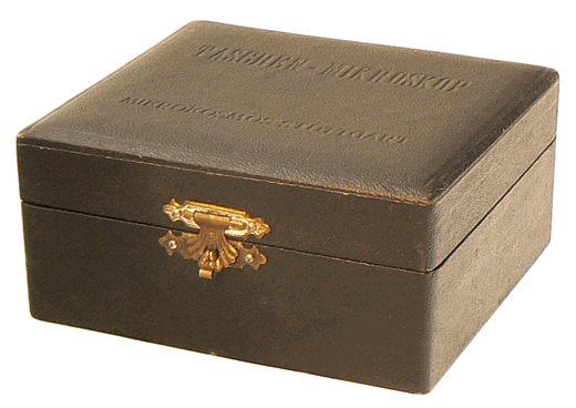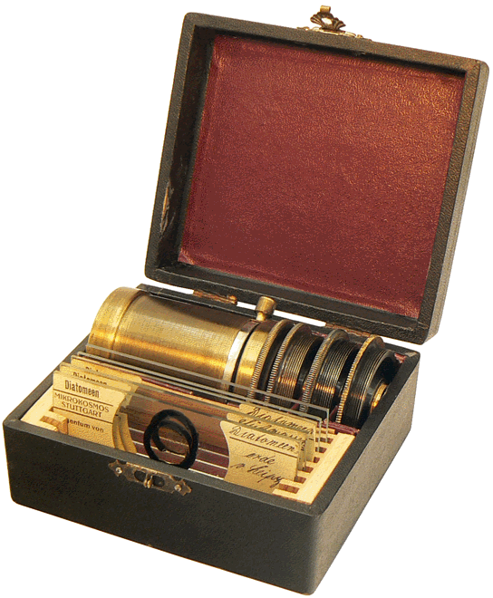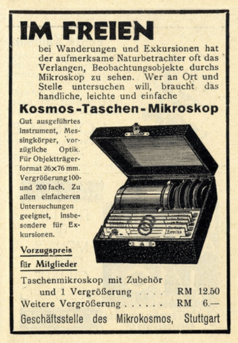 En 1929, le coffret contenant une optique correspondant à un grossissement est vendu 12,50 RM. Chaque optique supplémentaire coûte 6 RM. Le Reichsmark (RM) était l'unité monétaire allemande entre 1925 et 1948. L'image de droite correspond à un support permettant de tranformer le petit instrument en microscope de table... |