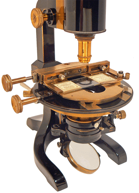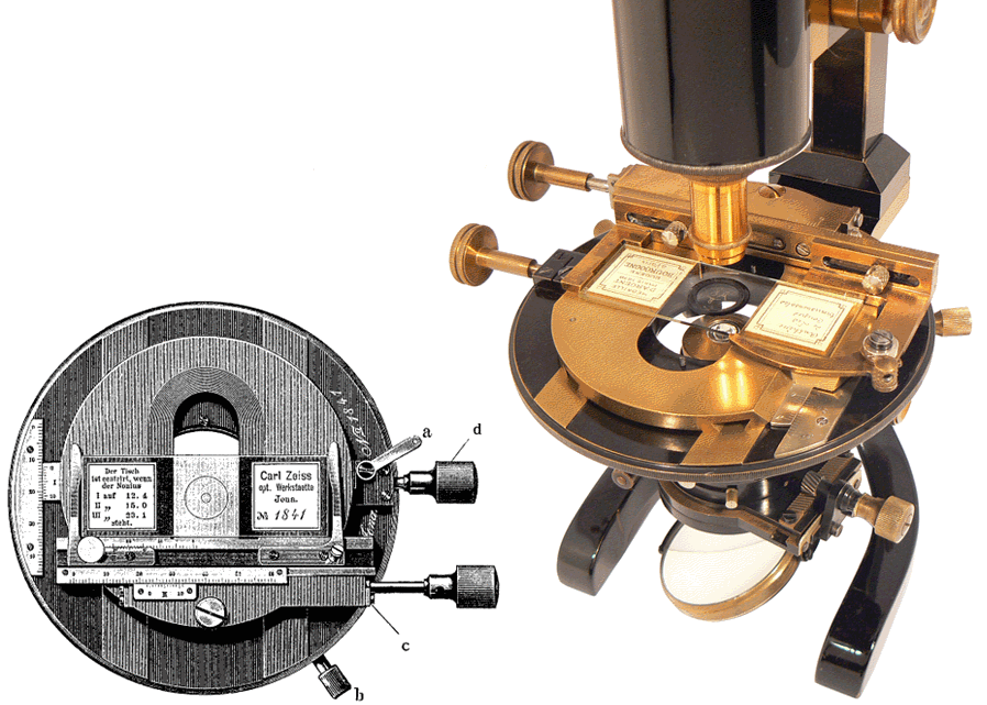 La platine à chariot mobile est semblable au grand modèle proposé par CARL ZEISS au début du XXe siècle. Outre le mouvement de rotation réalisable en agissant manuellement sur la platine, les mouvements orthogonaux de la lame porte-objet sont obtenus par le jeu de pignons commandés par deux boutons moletés et de crémaillères solidaires des parties du chariot mobile. Une réglette graduée en mm et un vernier au 1/10e permettent de repérer des points sur la préparation avec une précision de 0,1 mm. |