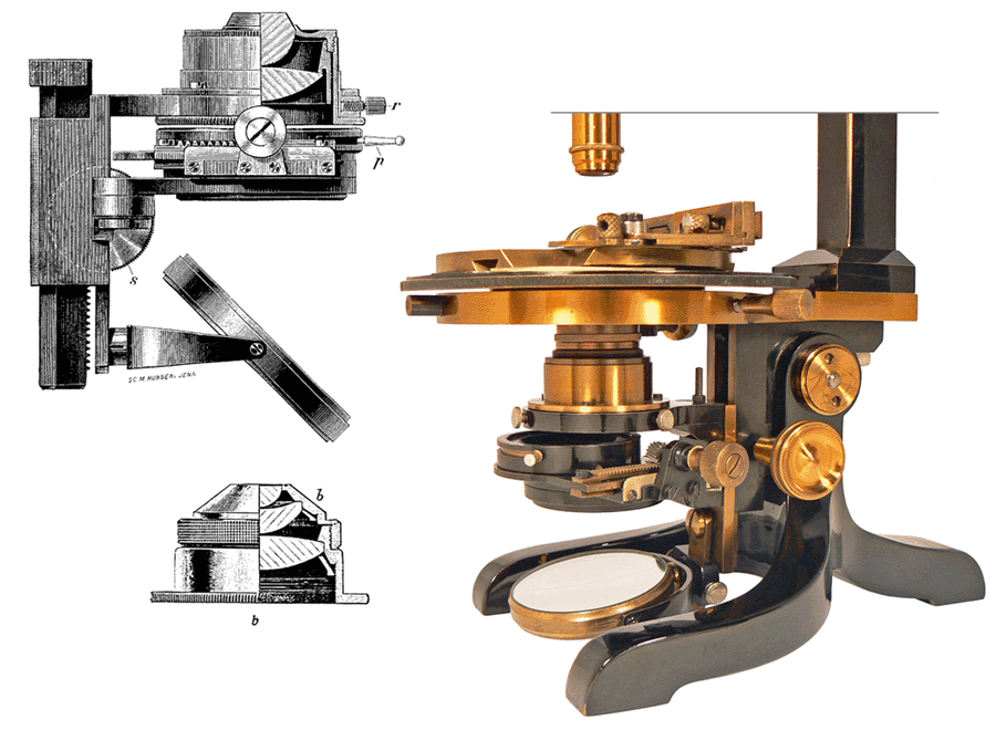 L'appareil d'éclairage d'ABBE, réglable en hauteur, se compose d'un condenseur à trois lentilles (b, qui remplace le condenseur à deux lentilles représenté sur le dessin d'ensemble) et d'un diaphragme iris dont l'ouverture peut être excentrée. Le miroir à deux faces, plane et concave, pivote autour de deux axes horizontaux. |