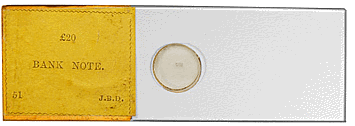 Les quatre lames accompagnent un microscope de poche de fabrication particulièrement soignée et doté d'un doublet de Wollaston. L'ensemble est rangé dans une petite boîte en bois de 11,5 x 9 x 7 cm dont le cloisonnement intérieur est réalisé en une sorte de carton obtenu par contrecollage de nombreuses couches de papier formant des épaisseurs atteignant 3 mm. Les éléments finis, remarquablement bien découpés puis assemblés, immobilisent et protègent les lames et le microscope. Il peut s'agir d'une réalisation artisanale. On observe, toutefois, une similitude entre la couleur des faces du carton et le jaune typique des étiquettes portant les trois lettres J.B.D... Une sorte de coffret-découverte ? |