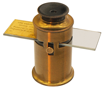 Si les premières microphotographies ont été produites par J. B. Dancer en 1839, René Dagron, reprenant l'idée, fit breveter le procédé vingt ans plus tard. Il combina le "microfilm" et la lentille de Stanhope en collant le premier sur la face plane de la seconde : ces lentilles étaient ensuite insérées dans des supports variés, bijoux, objets religieux, porte-plume, etc. pour offrir, à l'observateur visant à travers la face fortement convexe, des images agrandies. |