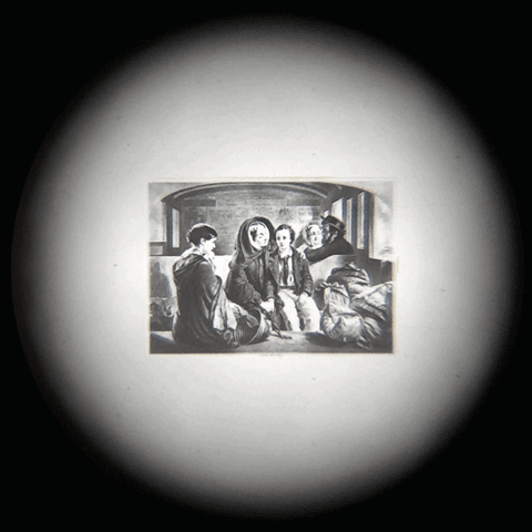 La microphotographie est réduite d'un peu plus de 400 fois par rapport à la gravure originale. Ci-dessus, la largeur du visage de l'enfant est égale à 1/10 mm, comme l'indique l'échelle du micromètre objectif photographié dans les mêmes conditions que le couple mère-fils et les autres personnages de la scène. |