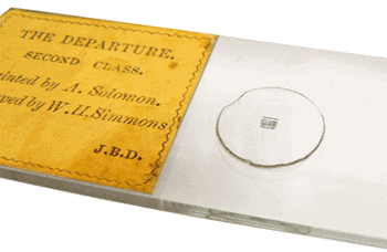Quelques lames préparées par John Benjamin Dancer, opticien à Manchester, fabricant d'instruments scientifiques (1812 - 1887) et pionnier en matière de microphotographie, sont déjà présentes dans le Compendium. Il s'agit, ici, d'un nouvel ensemble de quatre spécimens appartenant à la même série qui comprenait, vers 1870, une centaine de titres. Ces quatre lames accompagnent, dans un coffret en bois et carton dont nous ignorons l'origine, un microscope de poche d'excellente qualité utilisant un doublet de Wollaston et offrant un grossissement d'une cinquantaine de fois. Les images de présentation des lames microphotographiques qui suivent sont obtenues avec un microscope plus "actuel" et en utilisant divers grossissements. Nous revenons sur le coffret et le microscope de poche à la fin de la page... |