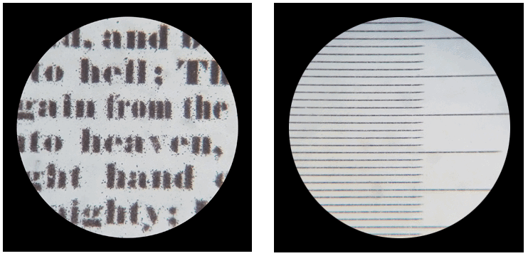 Ces deux photographies au grossissement de 400 fois représentent, à gauche, une partie du texte de "The Creed" microphotographié par Dancer et à droite la surface correspondante d'un micromètre objectif au 1/00 mm. Les deux photographies sont réalisées dans des conditions identiques. A droite, chaque petite division du micromètre vaut 0,01 mm. On peut évaluer à 0,02 mm la hauteur des petites lettres sur le texte de gauche. Même fortement grossies, elles sont nettes ce qui rend le texte parfaitement lisible. |