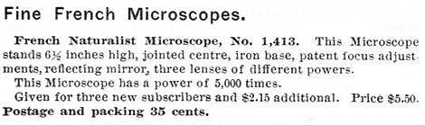 Une présentation, à côté d'autres modèles présents dans le Compendium, comme sur le catalogue BUSIEST HOUSE IN AMERICA de 1896. Le prix des instruments, destinés aux amateurs, varie entre 3 et 10 $ selon le modèle et les caractéristiques optiques. Les trois modèles ont probablement été fabriqués en France et importés aux Etats Unis... |