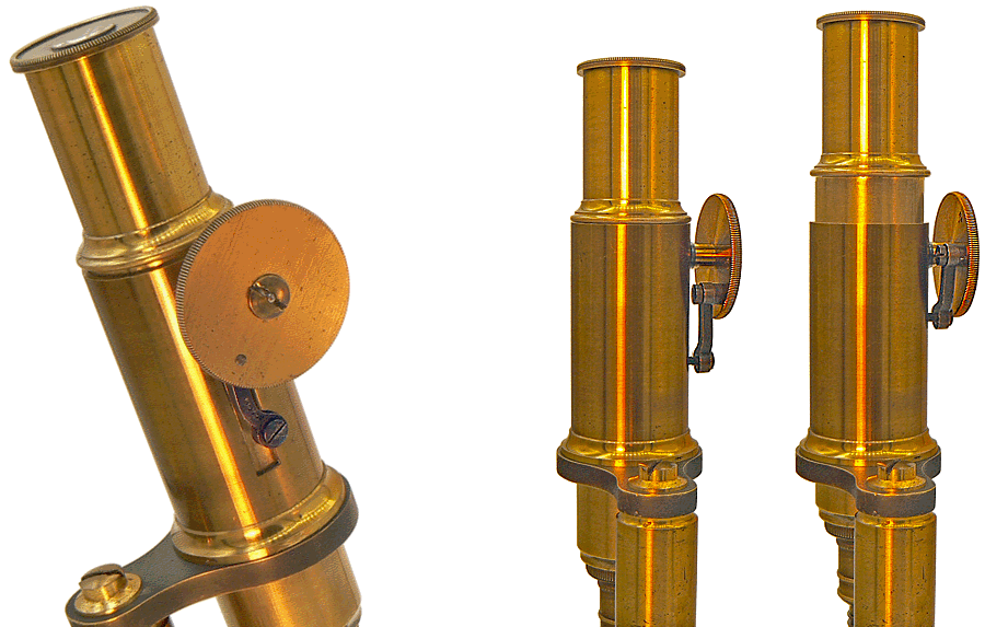 L'objectif est scindable et ses lentilles sont repérées par un, deux et trois points. Un tube à tirage permet, en augmentant la longueur du tube optique, d'augmenter le grossissement. Ce tube tiré à demi comme sur l'image de gauche, le grossissement maximum est égal à 500 fois. |