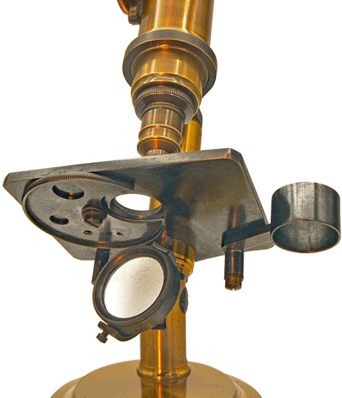 l'éclairage est assuré par un miroir articulé concave et un disque diaphragme. Un support amovible, actuellement écarté de la platine mais pouvant s'insérer dans un secteur évidé du disque, permet de placer un condenseur sur le trajet de la lumière qui traverse la préparation. |