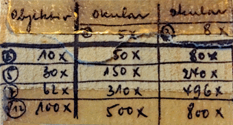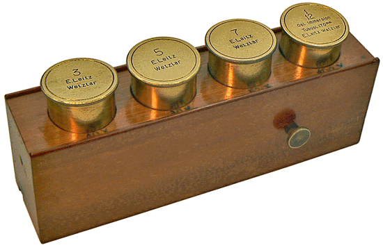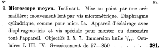 La partie optique grossissante est composée de trois objectifs à sec n° 3, 5, 7 et d'un objectif à immersion dans l'huile. Avec les deux oculaires I et III présents, on obtient les performances qu'un ancien propriétaire a inscrites à la plume sur une petite étiquette autrefois collée à l'intérieur du coffret... |