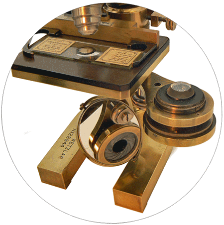 L'éclairage est assuré par un miroir de 5,5 cm de diamètre à double face plane et concave, un condenseur à deux lentilles et un diaphragme iris. A droite, l'image du diaphragme est actuellement visible par rélexion sur la face plane du miroir. |