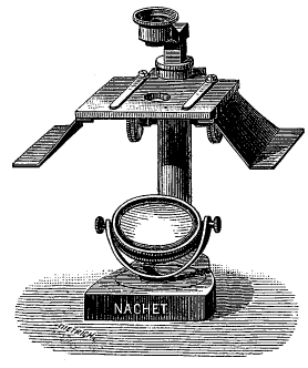 Le microscope de dissection apparaît être le modèle proposé par NACHET sur son catalogue de 1886. Les appuis-main, innovation de la marque, sont absents mais leurs fixations sont bien présentes sous la platine. Toutefois, notre spécimen ne porte aucune marque.