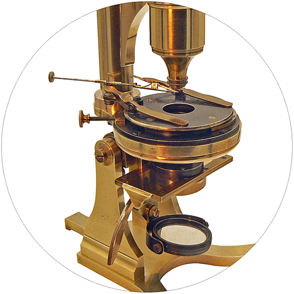 Le pied demeurant fixe, le tube optique et la platine peuvent pivoter à 360° autour de l'axe optique du microscope. En dotant l'instrument d'un dispositif de polarisation, il peut être  utilisé pour des études minéralogiques.