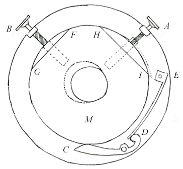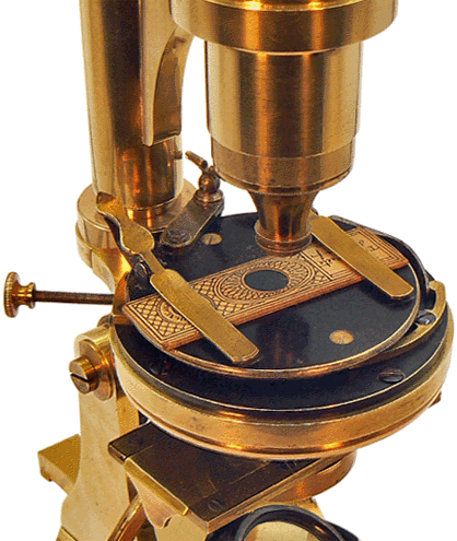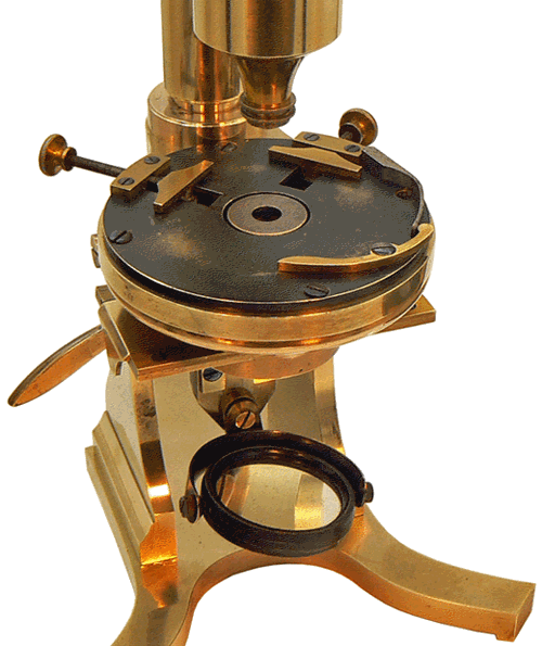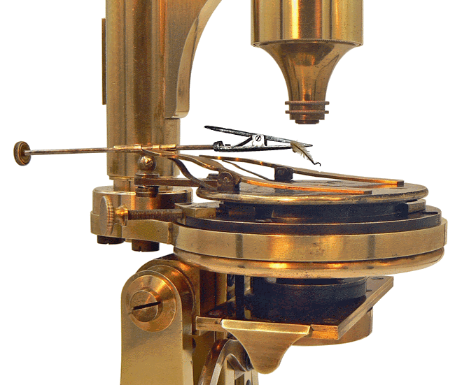 Sur ce dessin, tiré du TRAITÉ PRATIQUE DE MICROSCOPIE  par le Dr L. Mandl (1839), la semelle M de la partie mobile du chariot est encastrée entre les deux pièces à coulisse FG et HI et l'extrémité C du doigt pivotant DC. Elle glisse à déplacements faibles et dans toutes les directions du plan lorsque l'on agit sur les vis  A et B, l'extrémité C du doigt DC soumis à la pression du ressort fixé en E ayant toujours tendance à la repousser...