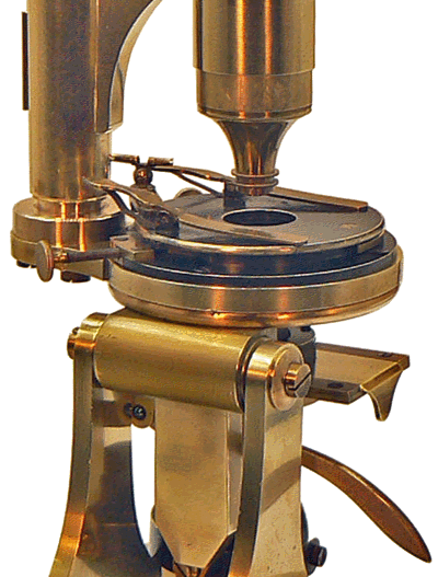A gauche, la base du chariot est fixée à demeure sur l'épaisse platine circulaire solidaire de la colonne du microscope.