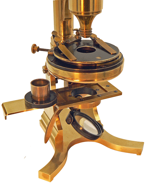 La base du microscope se rapproche beaucoup de la forme des modèles anglais. Toutefois, il est bien français et a été construit Rue St Jacques à Paris...