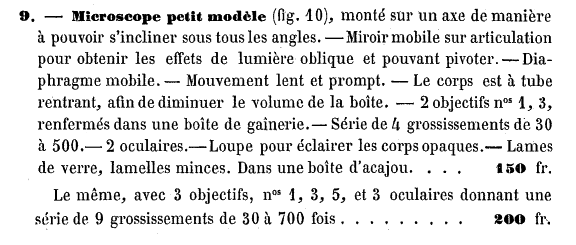 Le microscope petit modèle a été fabriqué de nombreuses années en présentant quelques variantes. C'est dans le catalogue de mai 1872 que l'on trouve l'image la plus conforme à notre spécimen à deux détails près : les valets apparaissent sous la forme classique et l'articulation du miroir est simplifiée. Avec la même dotation optique et en boite d'acajou, il valait alors 200 francs. |