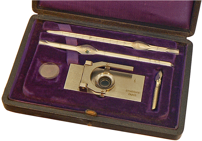 L'étui renferme quelques lancettes, une chambre graduée de Malassez à compresseur accompagnée de lamelles couvre-objet et deux mélangeurs de Potain permettant le prélèvement et la dilution du sang, Un des mélangeurs est destiné aux globules rouges, les hématies, et l'autre aux globules blancs, les leucocytes. Les tubes en caoutchouc à embout permettant de procéder au pipetage en toute sécurité sont absents : sans doute durcis avec le temps, ils ont été retirés de l'étui à un moment de sa vie. |
