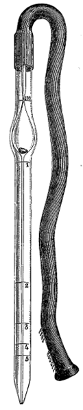 Les mélangeurs de Potain sont des micro-pipettes de précision permettant d'obtenir des petits volumes de solutions titrées. Leur réservoir, dans lequel se forment ces solutions, contient un petit fragment de verre cylindrique servant à brasser le mélange constitué par un faible volume de sang pipeté, après piqure du bout du doigt avec la lancette, et un liquide diluant également pipeté et variable suivant la numération à effectuer. L'un des mélangeurs est gradué pour réaliser les dilutions au 1/10, 1/50, 1/100, 1/200, 1/300 ou 1/400 et est utilisé pour les globules rouges ; son réservoir renferme un fragment de verre rouge. L'autre permet les dilutions plus classiques, par exemple au 1/100, des globules blancs, moins nombreux que les rouges ; son réservoir renferme un fragment de verre transparent. |
