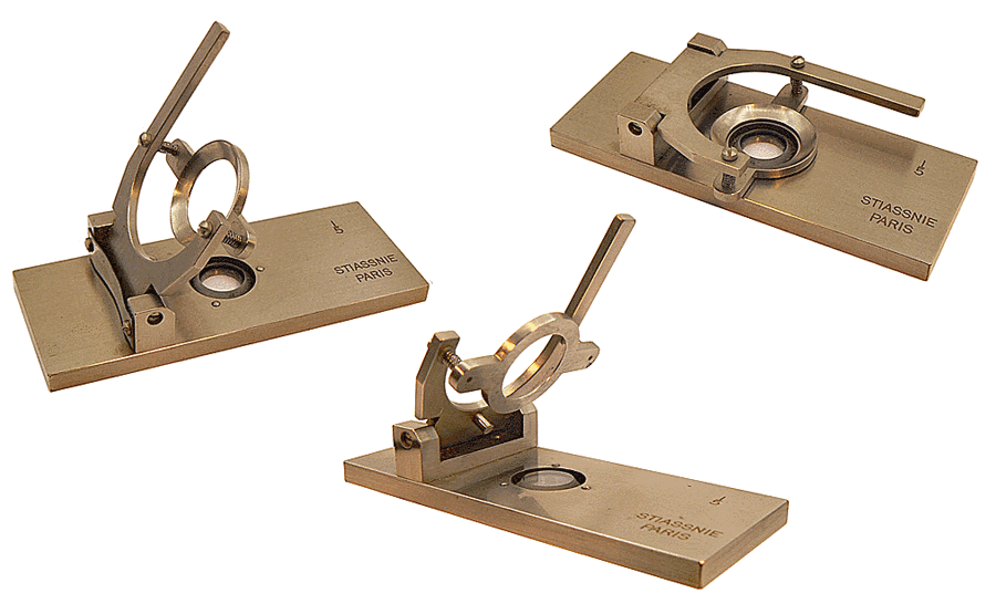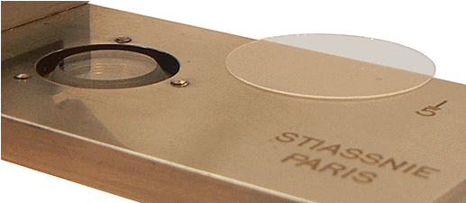 Dans cette plaque est enchassé un disque porte-objet en verre épais. Sa face supérieure, qui affleure la plaque, est gravée de 10 rangées de 10 rectangles. Une rigole circulaire entoure la zone quadrillée. |
