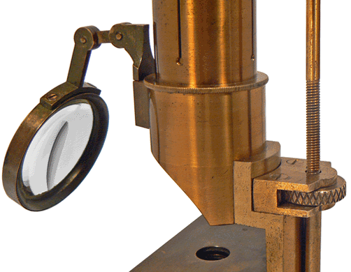 Ce microscope a subi une modification probablement après sa sortie des ateliers Oberhaeuser. Il s'agit de l'adjonction d'un dispositif de mise au point par molette entraînant une tige filetée reliée, par une pièce en forme de fourche, à la collerette du tube optique. |