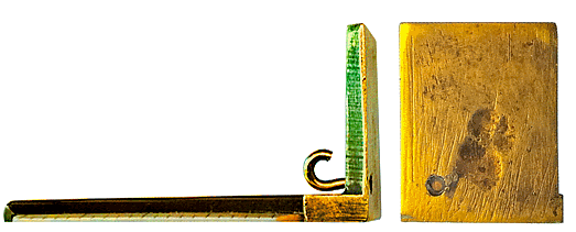 Ce microscope demeure mystérieux. L'objectif, au grossissement modulable et modéré, surmonte un élément amovible, actuellement maintenu à l'avant du socle de l'instrument par une patte façonnée en queue d'aronde. Cet élément porte une petite règle en ivoire de 2 centimètres, graduée en millimètres et un minuscule crochet pivotant sur lui-même. |