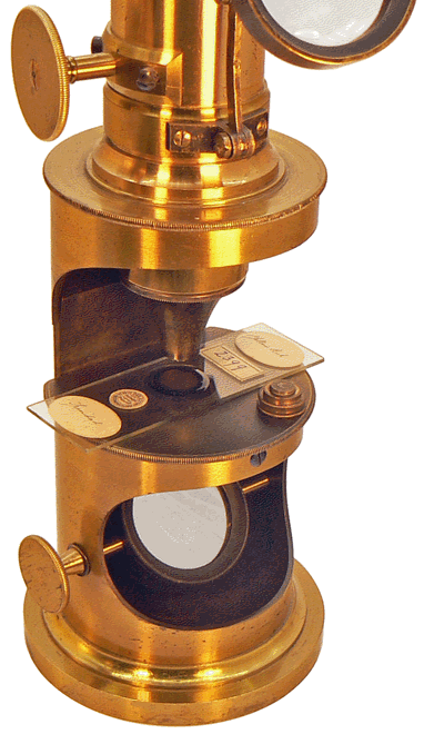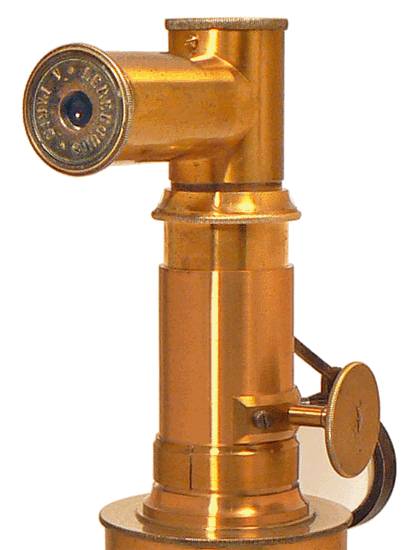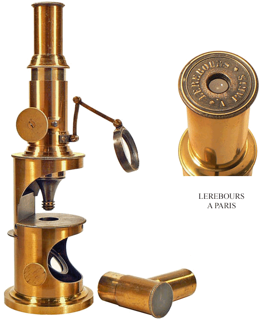 Dans son ouvrage, "INSTRUCTION PRATIQUE SUR LES MICROSCOPES" (1846), Noël Paymal LEREBOURS décrit son microscope achromatique simplifié, dont nous avons, ici, la version