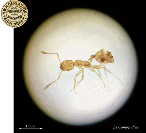 Nous avons suivi les conseils du constructeur et observé, au plus faible grossissement, une fourmi "Yellow Ant" préparée par Herbert W.H. Darlaston, probablement dans les années 1900. Seule la lentille la plus faible est montée sur le cône intérieur de l'objectif, le cône extérieur demeurant sans optique. Avec l'oculaire faible, le champ, d'un peu plus de 6 mm permet d'observer l'insecte dans sa totalité (ce champ est légèrement réduit lors de la photographie). |